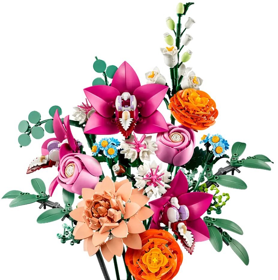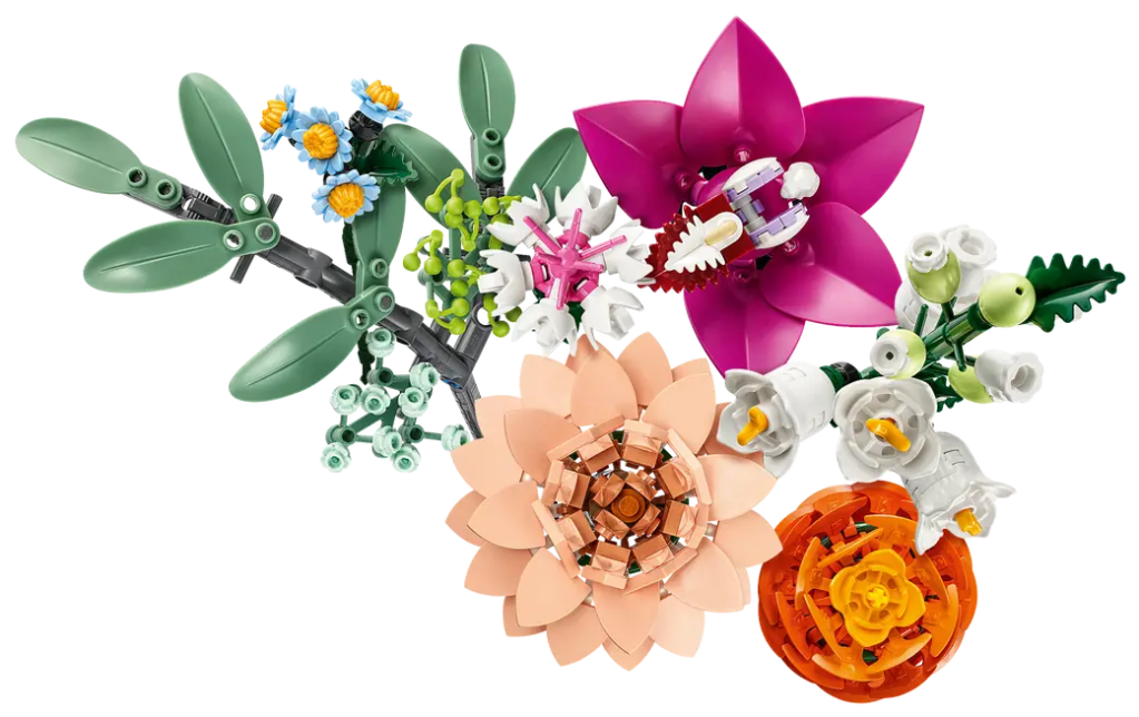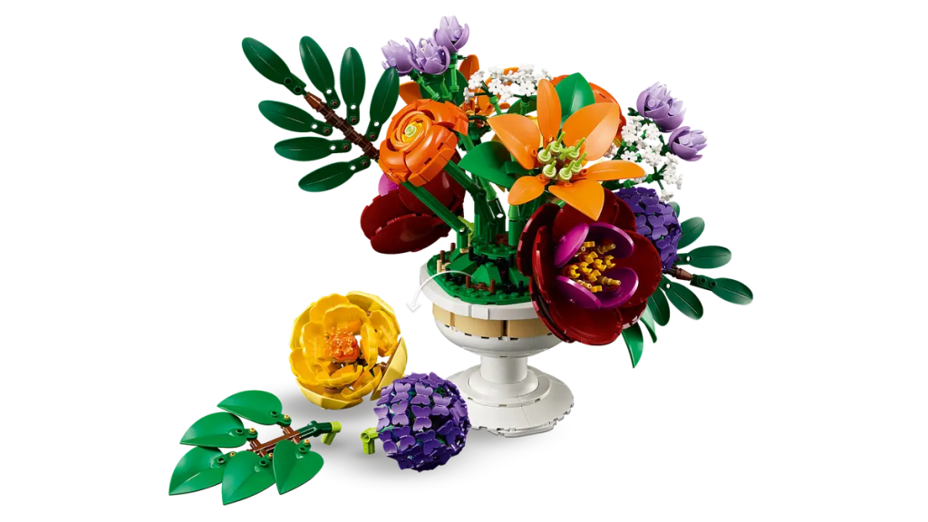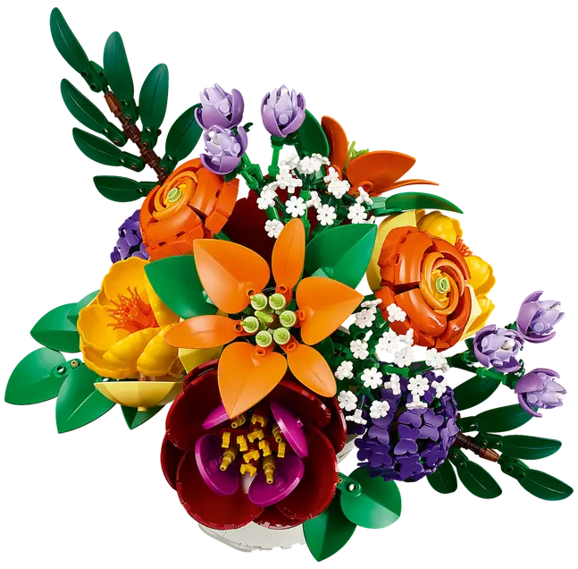 10345 Flower Arrangement (releasing February 2025) sits somewhere between a bouquet and the four smaller plant sets. Whilst this set does have a brick-built base and pot, its also stuffed full of individual flowers!