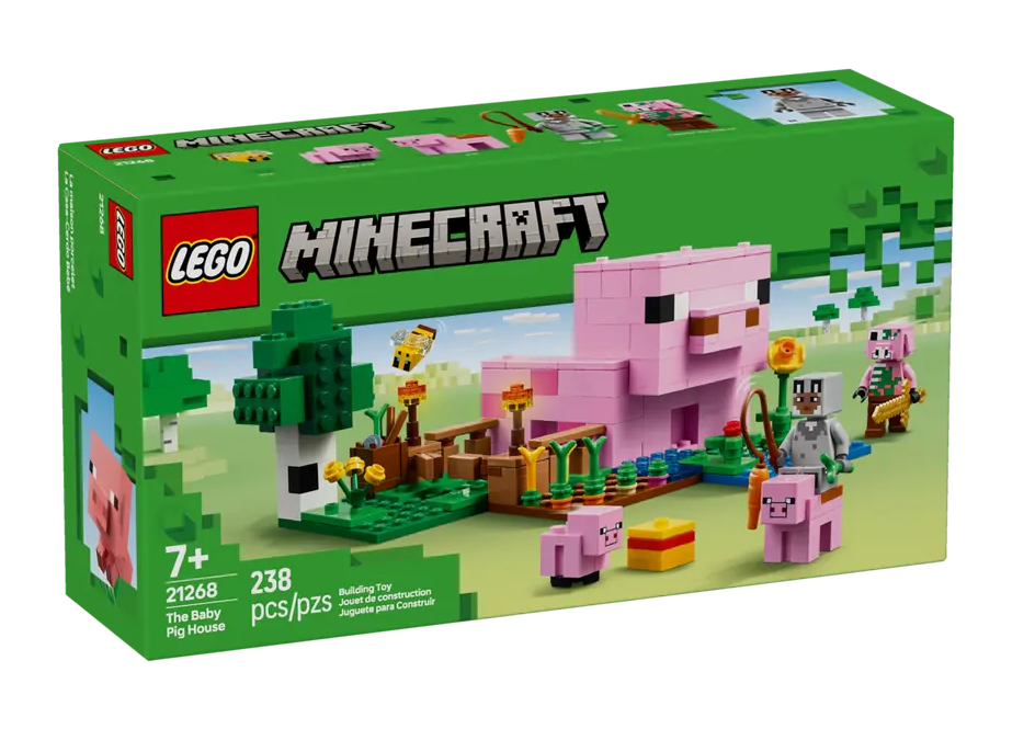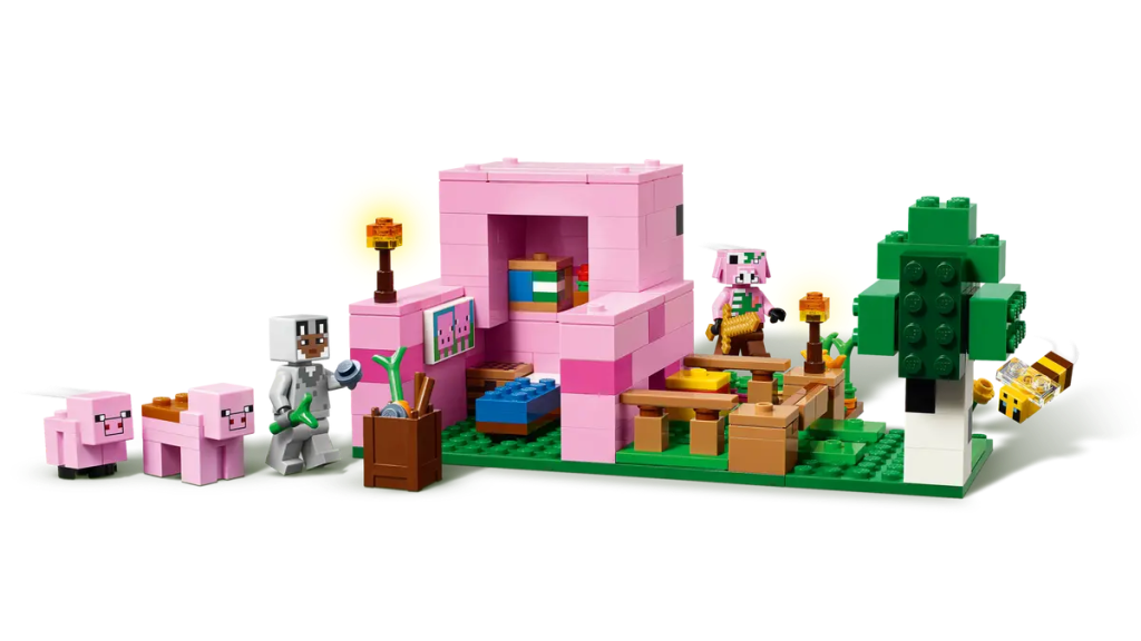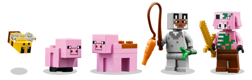 Continuing Lego’s trend of releasing mob themed houses is 21268 The Baby Pig House. 238 pieces, one player Minifigure, two pigs, a bee, and a zombified piglin.