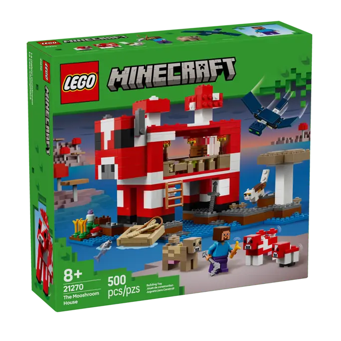 500 pieces including one Steve Minifigure, a red Mooshroom, a baby red Mooshroom, a brown Mooshroom, calico cat, and flying phantom.