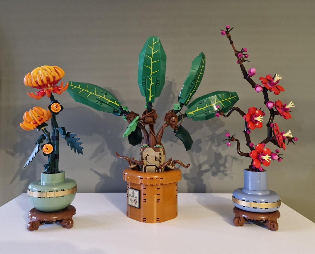 Visually the Mandrake fits with other Botanical sets. I’ve placed it alongside 10368 – Chrysanthemum and 10369 – Plum Blossom for reference. The pots are roughly the same size, however, the Mandrake’s large leaves take-up quite a lot of space. (It will be interesting trying to shelve this set!).