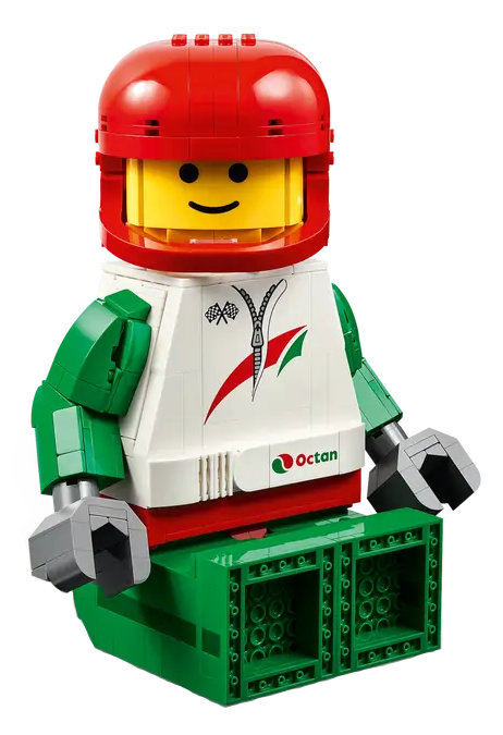 Coming soon on March 1st is Lego’s latest Up-Scaled Minifigure. 40819 Up-Scaled Racing Driver Minifigure is clearly referencing retro Lego Town racing sets, but the red hips, and torso details give it a modern appearance.