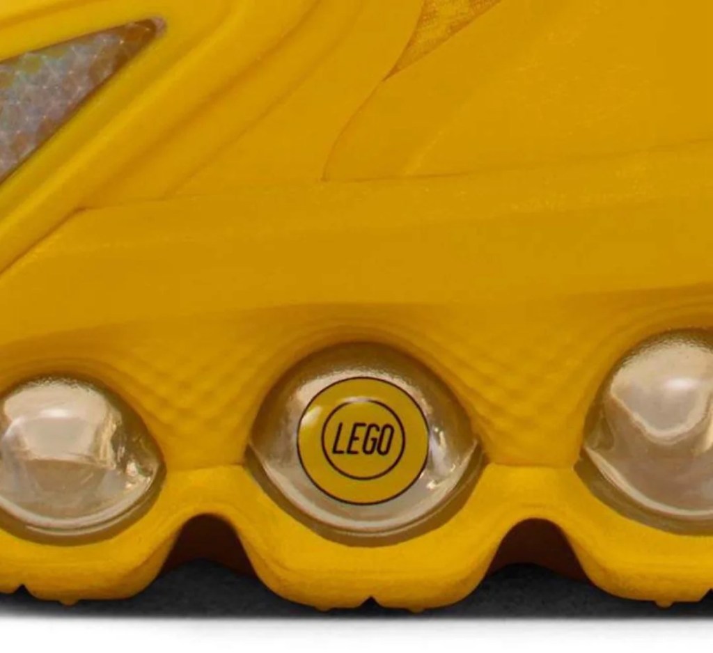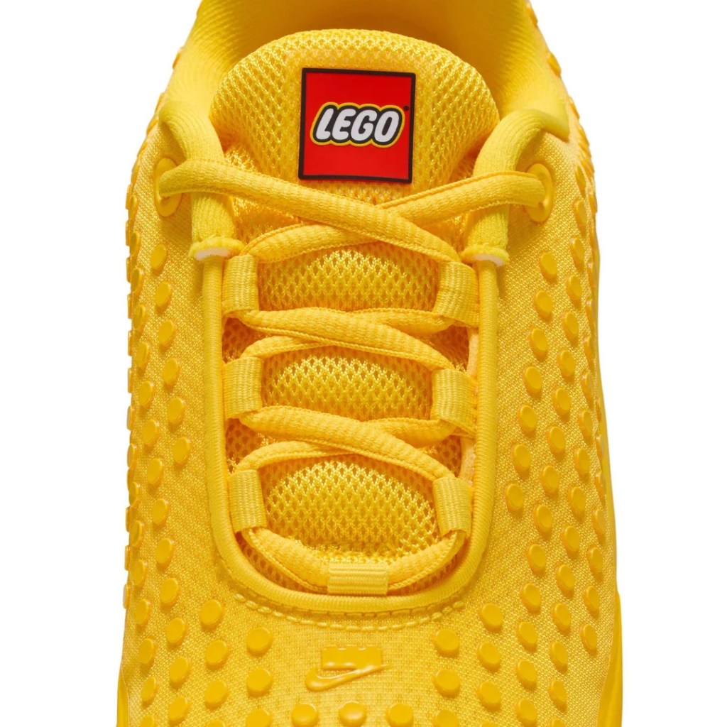 The bright yellow sneakers heavily feature LEGO references from the LEGO logo to the studs covering the upper-part of the shoes.