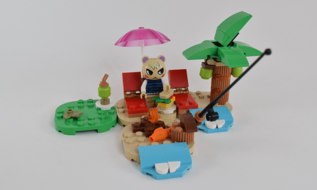 The bag builds four small island sections, three of which are sand, and includes a campfire, fishing station, and a palm tree complete with two coconuts. The set designers have done a great job transforming the New Horizons style palm trees into LEGO system.