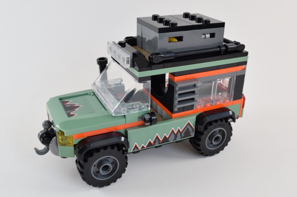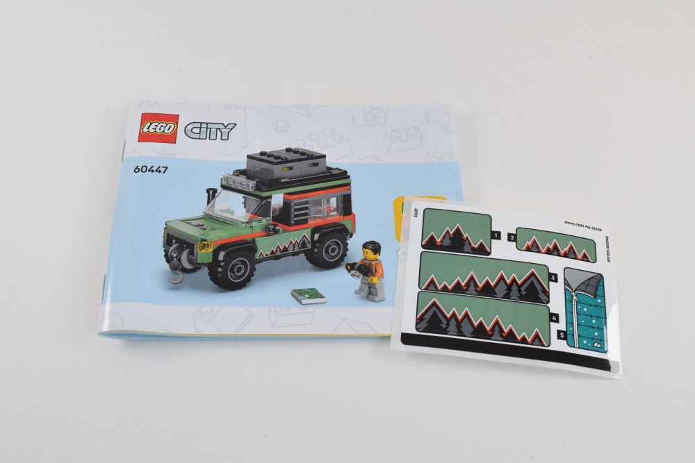 60447 Off-Road Mountain Truck comes replete with accessories including a shovel, banana, wrench, compass, first-aid kit, and a flash-light. The back of the truck utilises a sticker to create a removable sleeping bag tile.