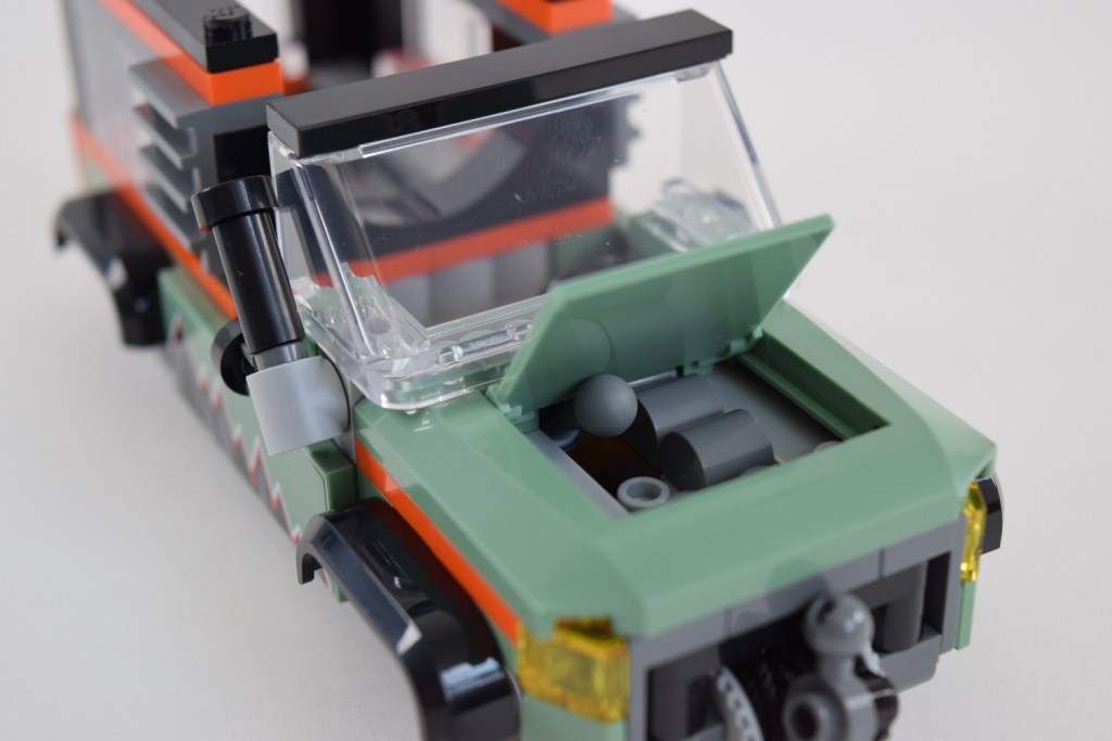 The truck’s tow-hook is fully accessible and works perfectly and is a overall great play feature. The truck engine makes use of 1×1 curved grey bricks and the steering wheel is the standard LEGO piece