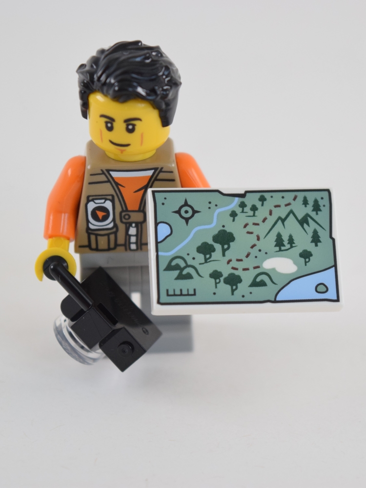 The minifigure comes with a camera and unique printed map tile.