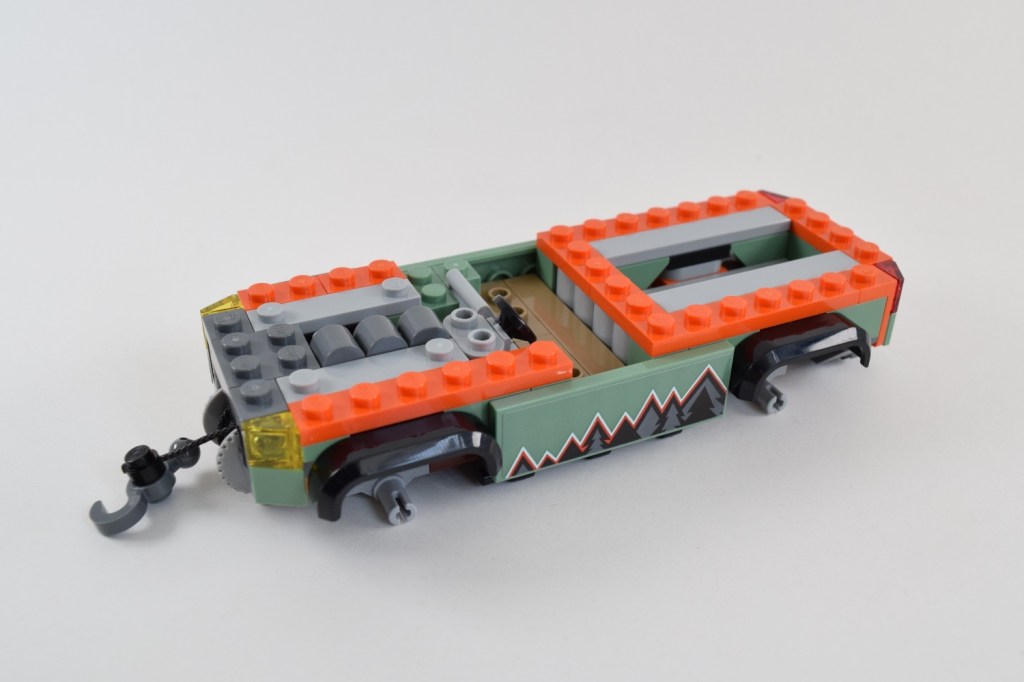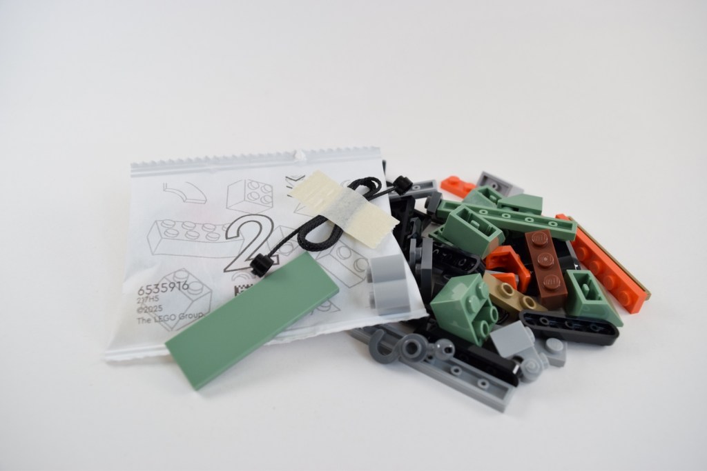 By this point the sandy green and orange colour scheme is starting to show and the truck’s tow-hook has been attached. The LEGO string element came nicely packaged to avoid any knots or tangles. It’s small things like this, that make LEGO such a joy to build.