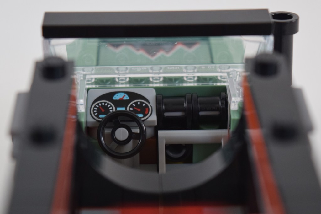 The roof of the truck can also be easily removed to allow for minifigure access, storing accessories, or in this case, taking a close-up photo of the printed dashboard piece.