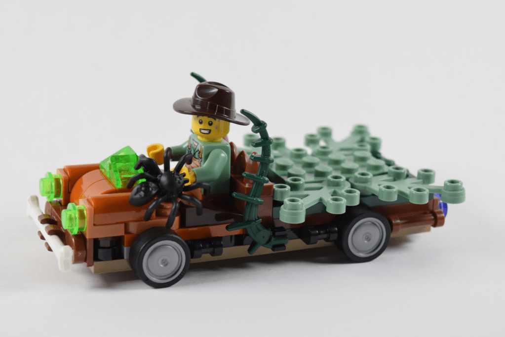 The truck is replete with a flat-bed, vines, and a hitch-hiking spider who seems to have startled the minifigure so much his hat has gone wonky.