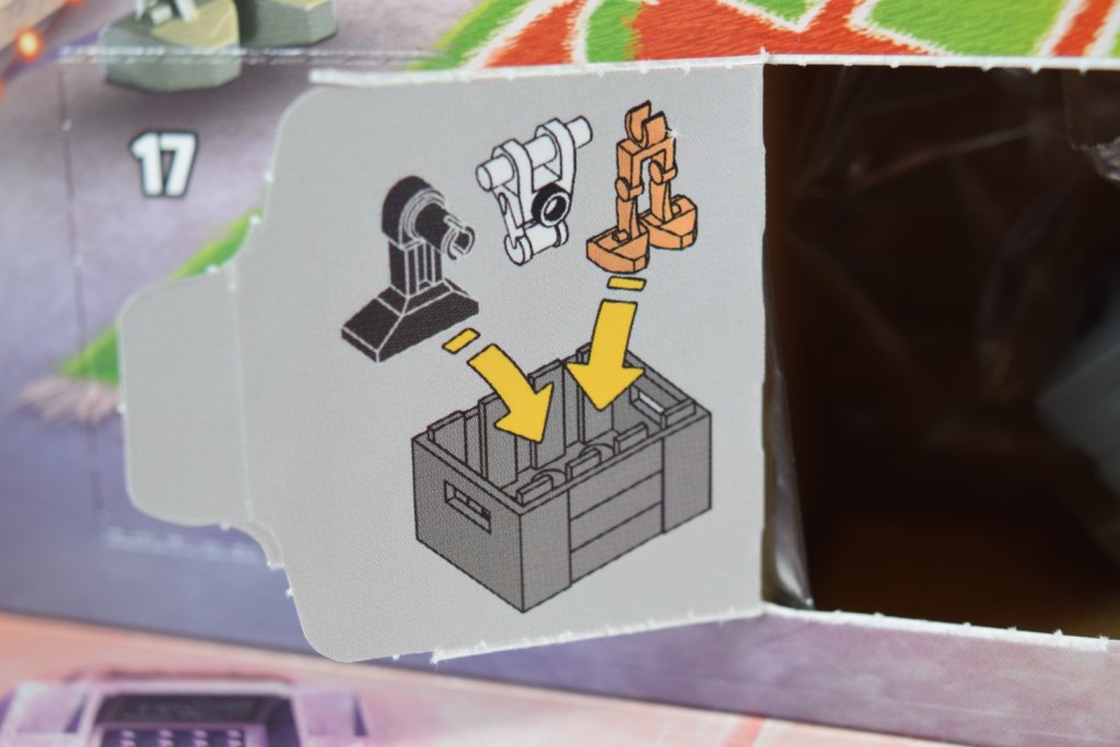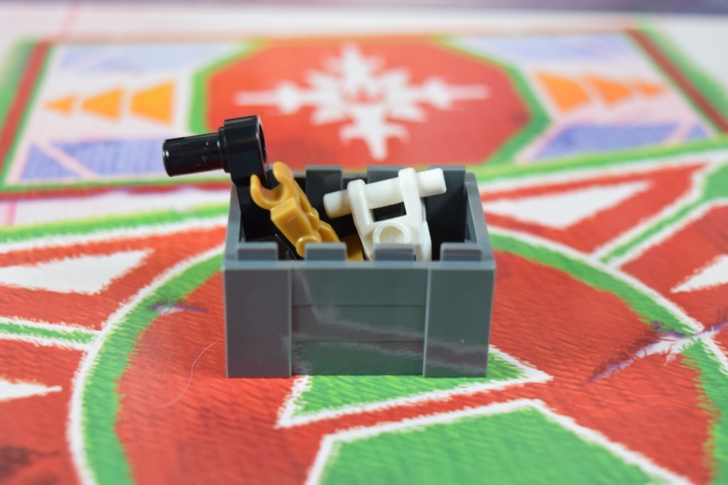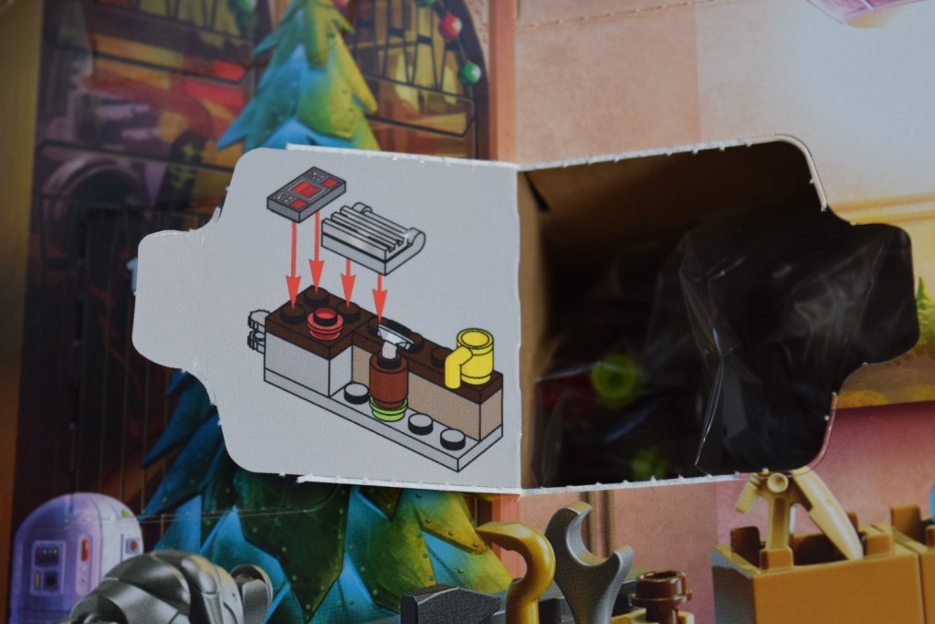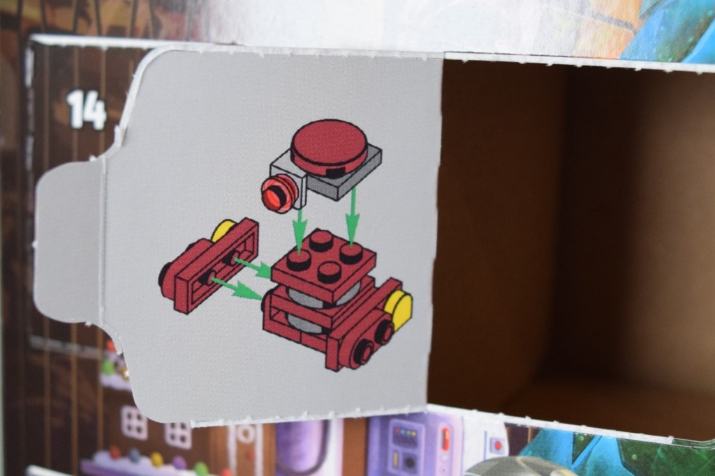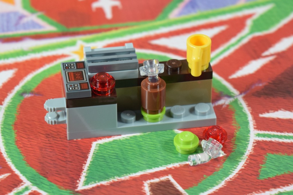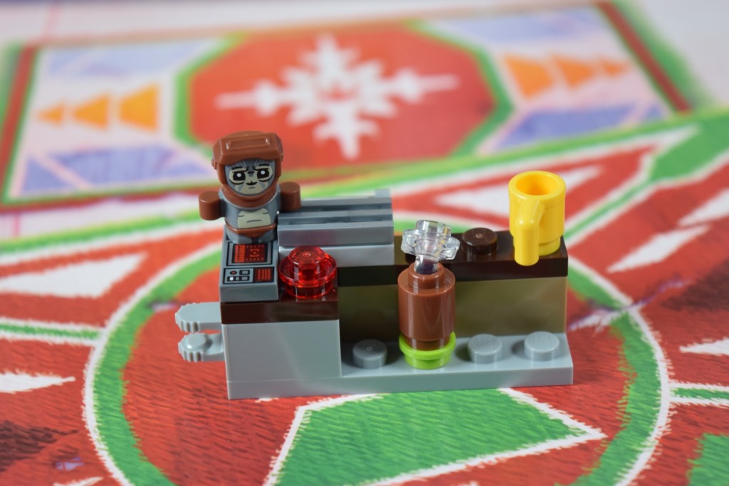 Day number two rewards us with a small workbench build. This simple build comes together in 13 pieces with 3 extras. Included is a printed console tile which gives the build a much needed sci-fi feel.