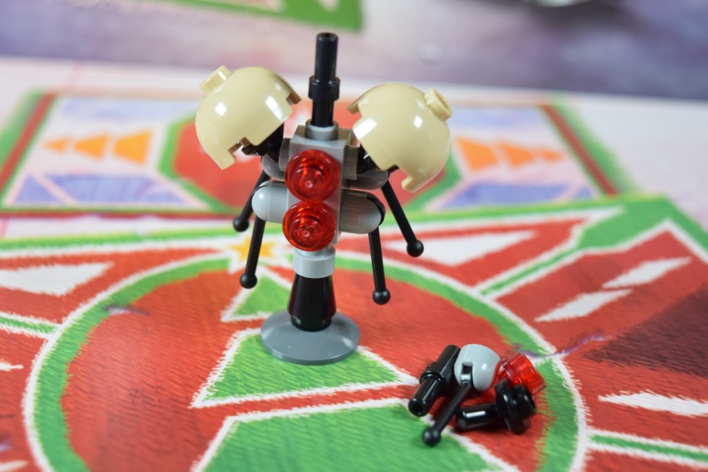 The round tan elements are doing most of the work when it comes to this build. I think it’s let down by the thick stand. In the Star Wars universe Buzz Droids typically have thin robotic legs, and whilst the antenna pieces are meant to mimic this, the cone and dish pieces take away from the effect.